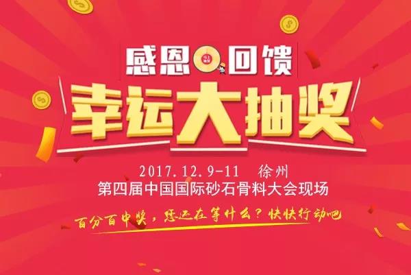 2017年12月9日至11日,江蘇徐州即將召開“第四屆中國國際砂石骨料大會”,同期舉辦“中國砂石協(xié)會2017年年會”、“第二屆全國砂石骨料大賽”等活動,屆時,鄭州一帆將會在現(xiàn)場舉行幸運刮刮獎活動,到現(xiàn)場的各位可以來到我們的13號展臺前參與活動,商務必備四件套、紅木書簽等豐厚大獎就是您的了,凡到場各位還有精美禮品相送哦!