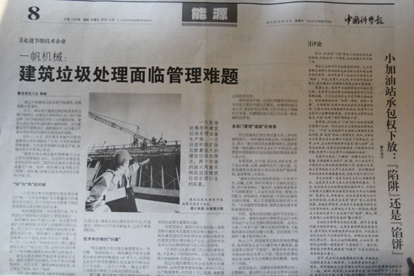 近日,南京建筑垃圾回收再利用點落戶建鄴區,如果這個再利用點24小時不停運轉,則可消耗南京市約1/4的建筑垃圾。建筑垃圾處理后形成的再生建筑材料,還可重新應用于建筑設計、道路鋪設中,從而減少開采自然材料對環境和資源造成的消耗。 實際上,北京、深圳等許多城市目前均就建筑垃圾處理制定了計劃,可實際發展卻困難重重。尤其是該領域的設備生產商,發展的艱辛外界難以體會!敖ㄖ幚碓O備的銷售額只占全公司年銷售額的25%,而這樣的成績還是辛苦打拼而來的!眹鴥戎ㄖ幚碓O備生產商,鄭州一帆機械設備有限公司(簡稱一帆機械)銷售總監張現團對《中國科學報》說。